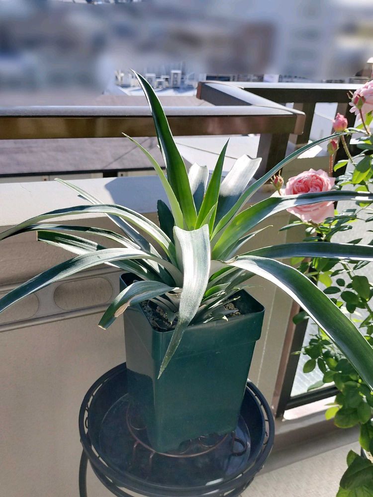 ②スーパーで買ったパイナップルを8月に葉挿しして育てているもの。この子も丈夫で日本の酷暑で調子が良いくらい。陽に照らされた葉もキラキラ輝いて美しい。そろそろ夜は家の中かな?