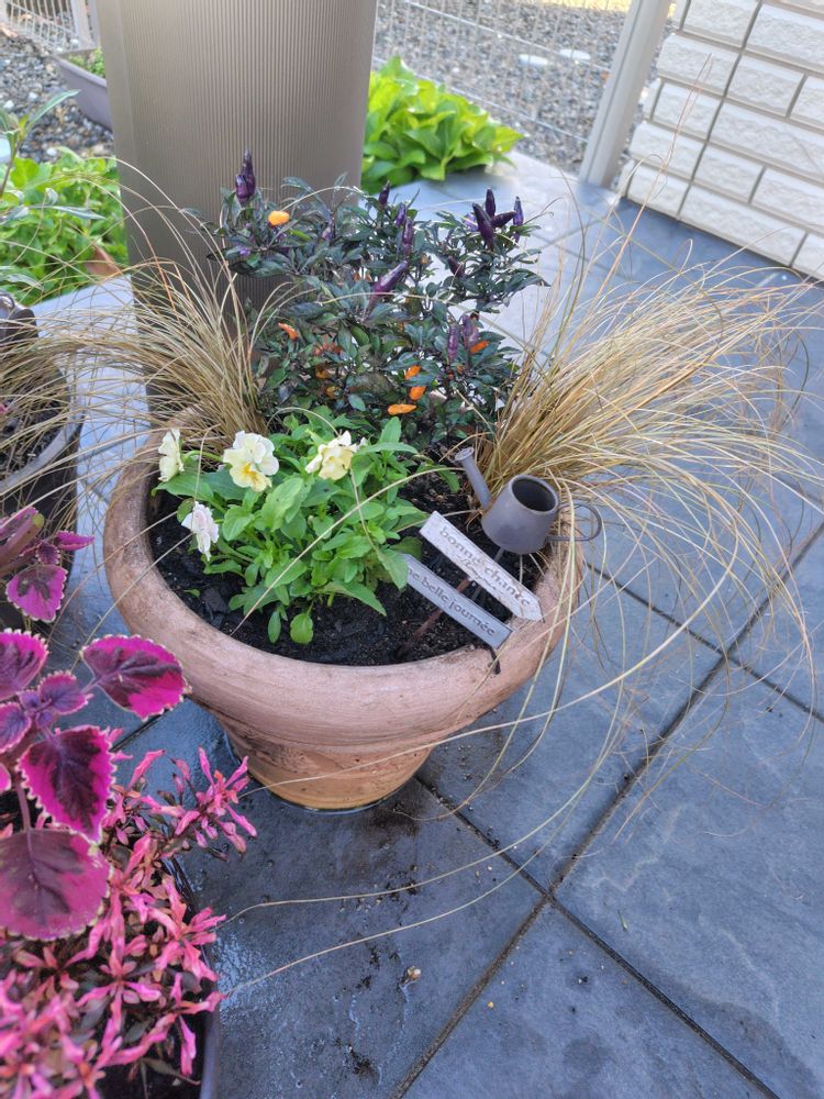 今日、ビオラやカレックスなどを使って新しい寄せ植えを作りました!🌼.*