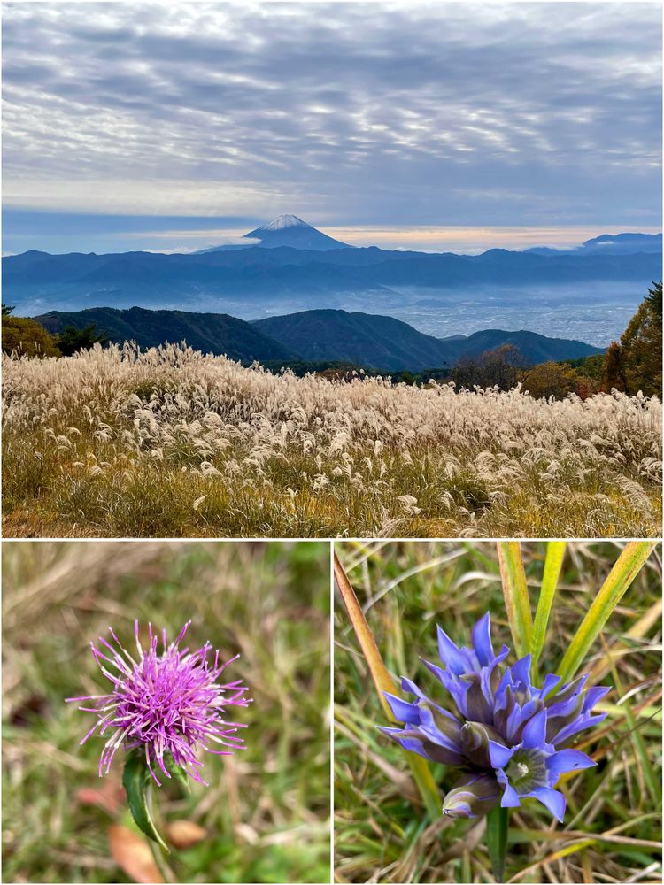 遥かに見る富士山🗻美しいです ススキ群の根元にアザミ・リンドウが色を添えていたのですね✨オモイグサもススキの根元が好きなようで…見た事があります ススキは案外草花のゆりかごかも😌