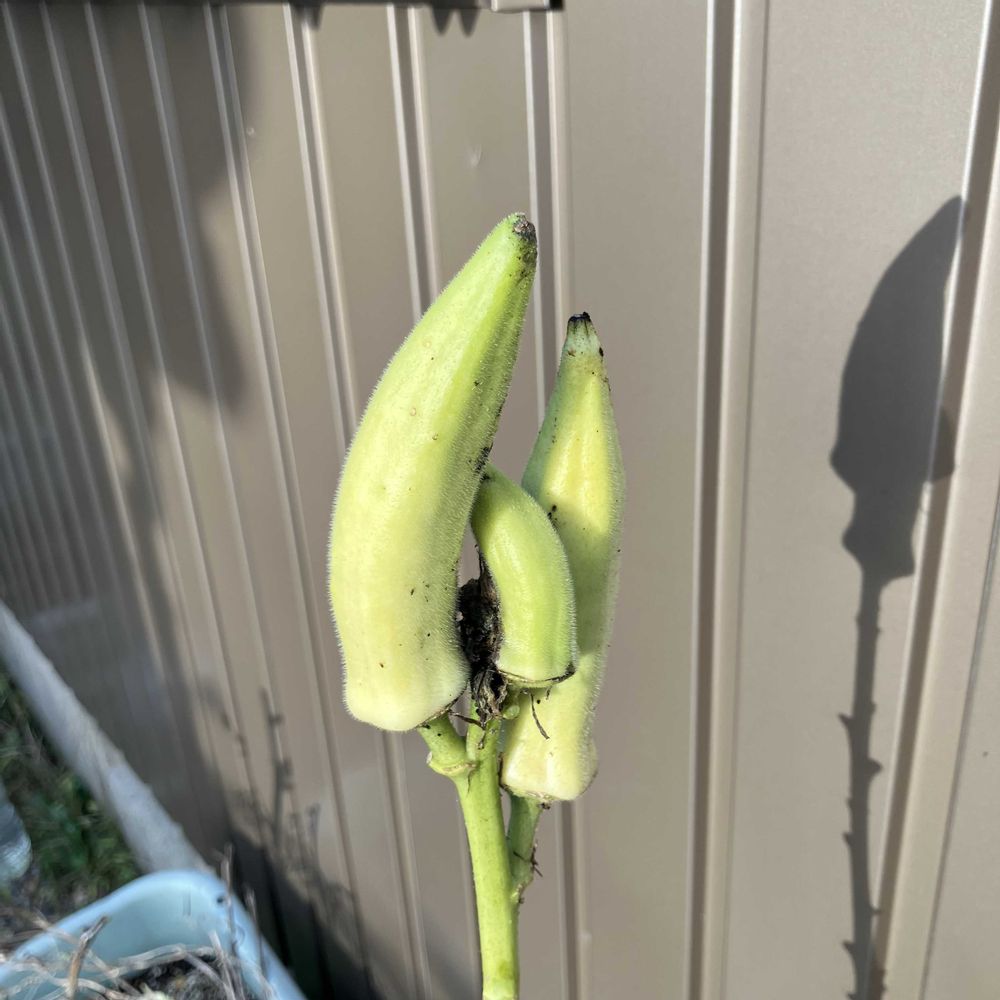 ④丸オクラ。種を蒔いていたものです。さっぱり開花しないからほぼ放置していたのですが、オクラの実が!!