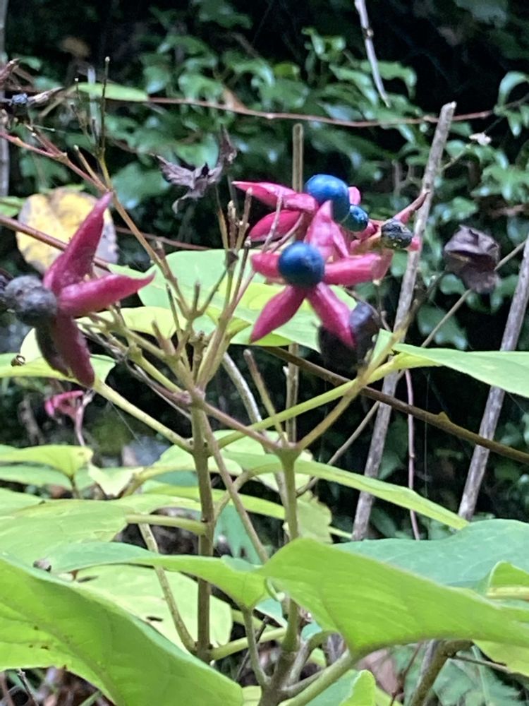 白いお花からは想像がつかない実ですね。青い実は、草木染めにも使われているようです🤗