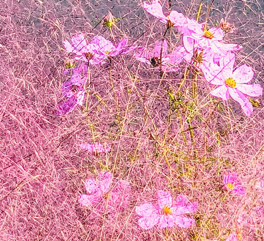 コスモスがね、今年はミューレンベルギアの隣で