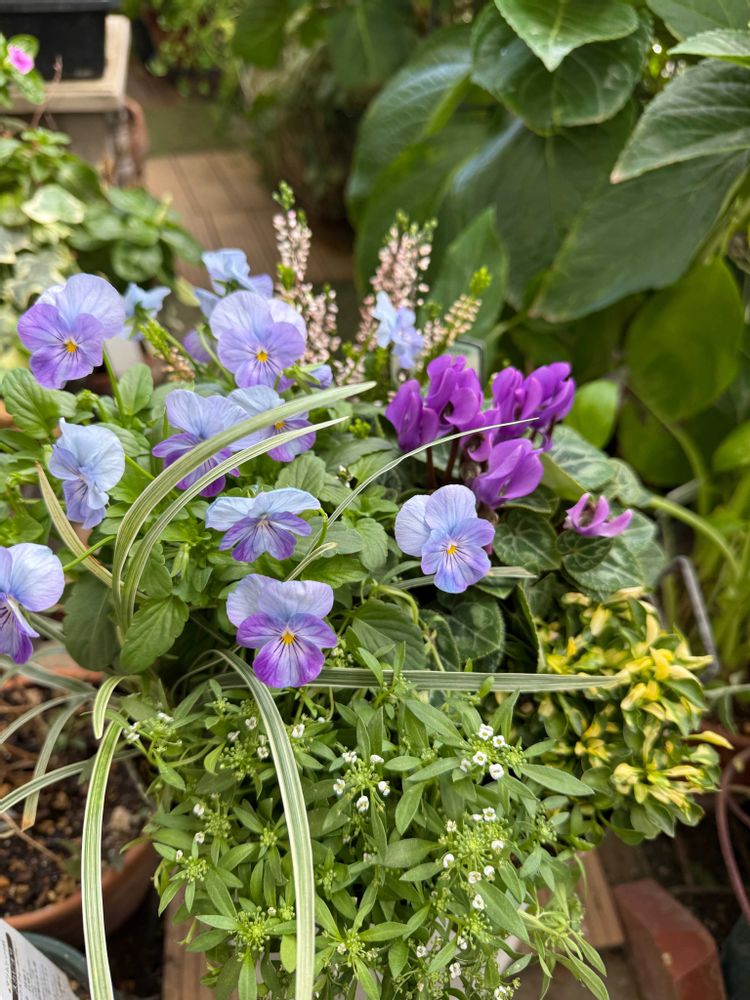新色らしいです。このミニシクラメンありきの寄植えをつくりました。同じくパープル系のビオラを合わせました。
