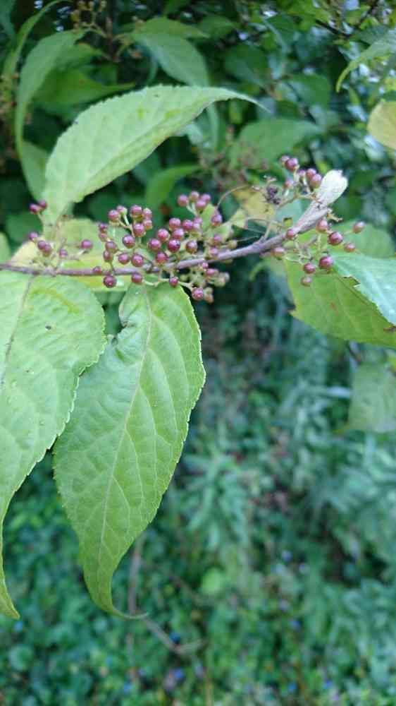 林の縁で、自生している野生のムラサキシキブです。なので、3メートル位の背丈があります。果実は、2~3ミリ位の大きさしかありません。まだ、紫とは程遠く、秋の深まる🌾10月頃にきれいに色づきます🤗