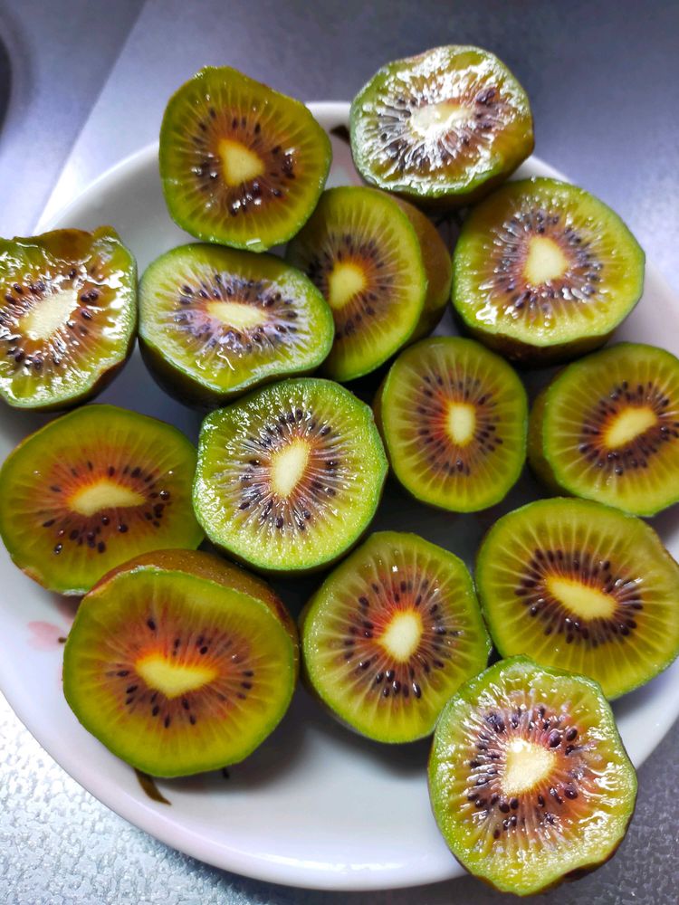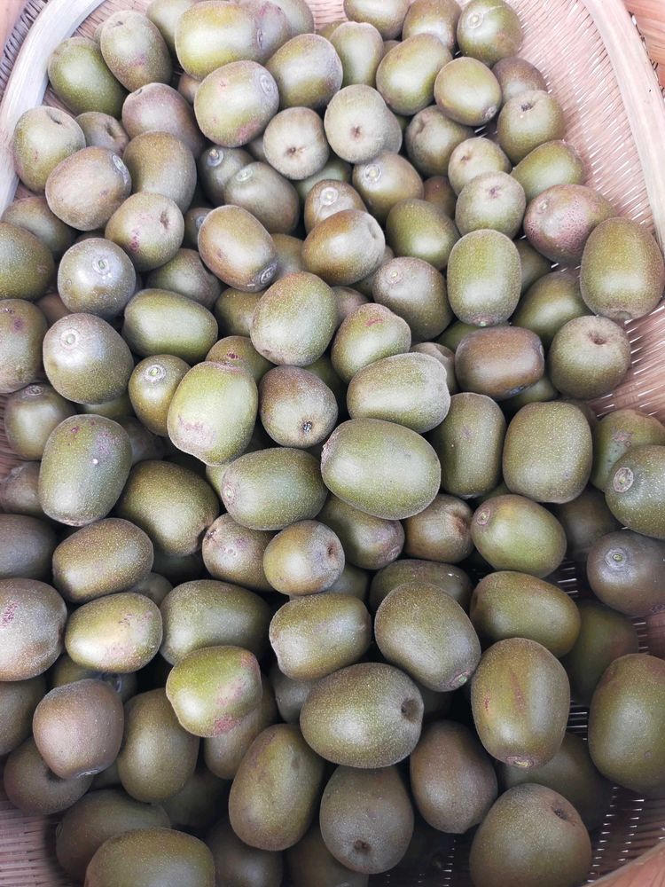 この品種は グリーンのキウイ🥝より少し小さいのですが 今年は出来過ぎで特に小さい! また樹上で甘く成るので、収穫中に試食もします。