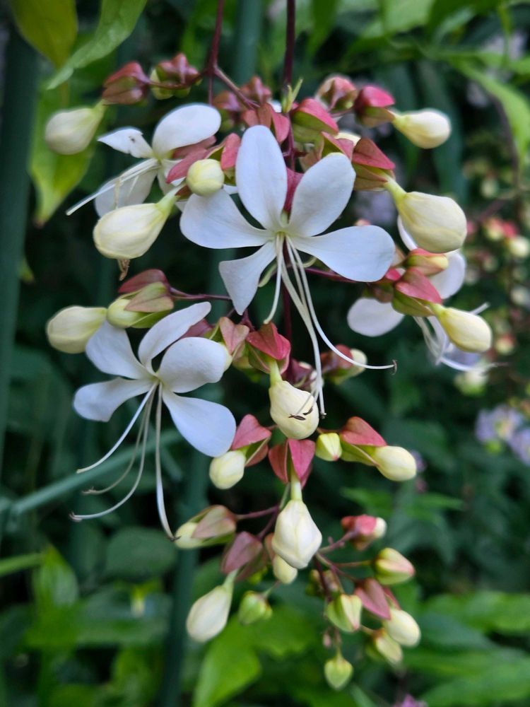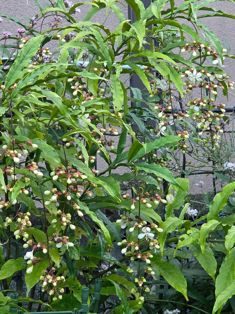 今朝の庭、クラリンドウの白いお花が咲き出しました。