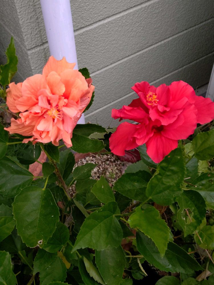 同じ木から違う色が咲くハイビスカス🌺🧡❤️がまだ咲いてます
