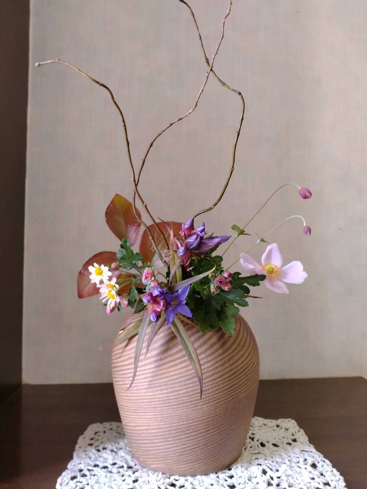 リンドウが無かったのなら、シュウメイギクを正面に持ってきてもよかった気がします。その場合は花器との一体感が出たと思います。リンドウだとメリハリが楽しめ、シュウメイギクだと一体感でした。