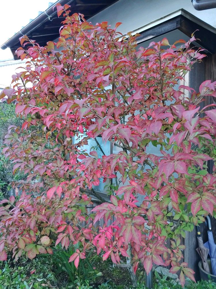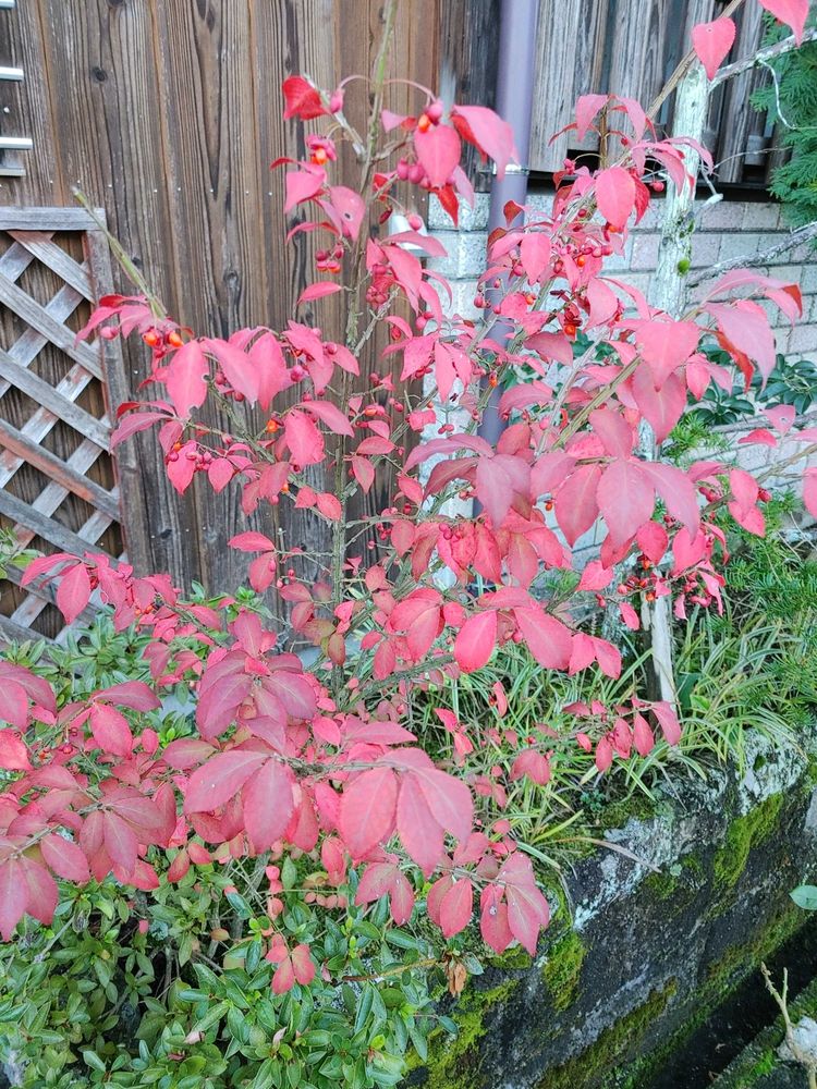 玄関前のニシキギの紅葉が2本でこんなに違います。