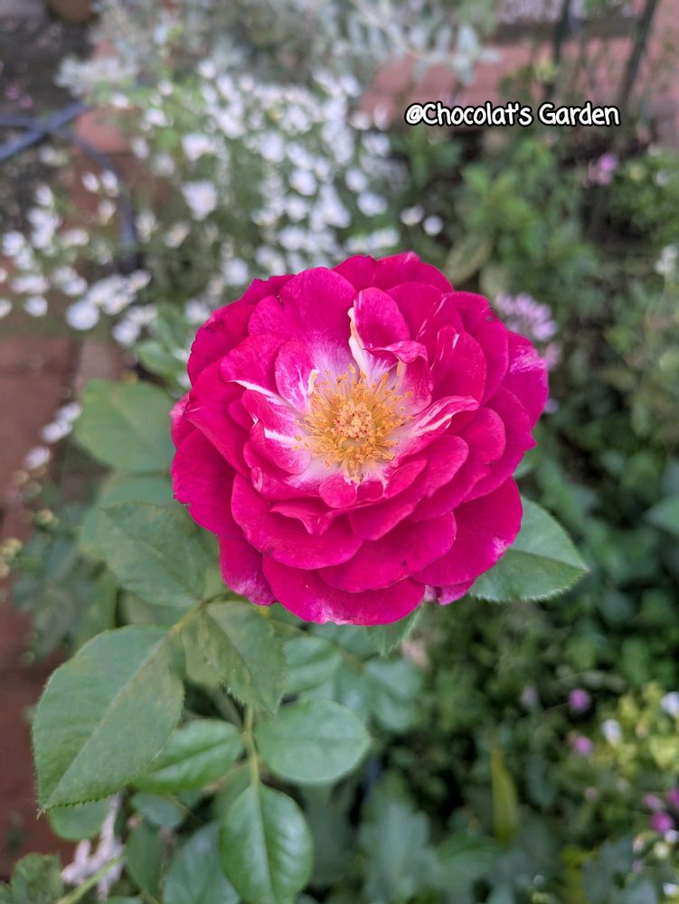 鮮やかな赤紫に黄色の蕊で華麗なバラです。