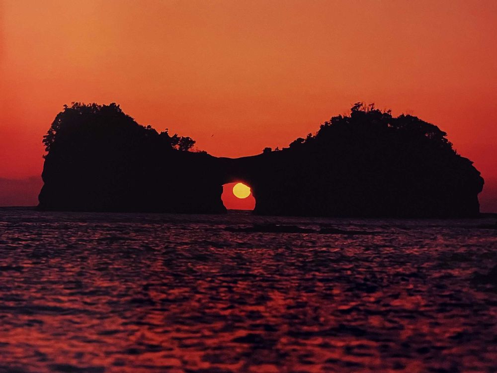 島と島の間から顔を覗かせてる夕陽、good timingをじっと待ってバッチリ👍🤭
