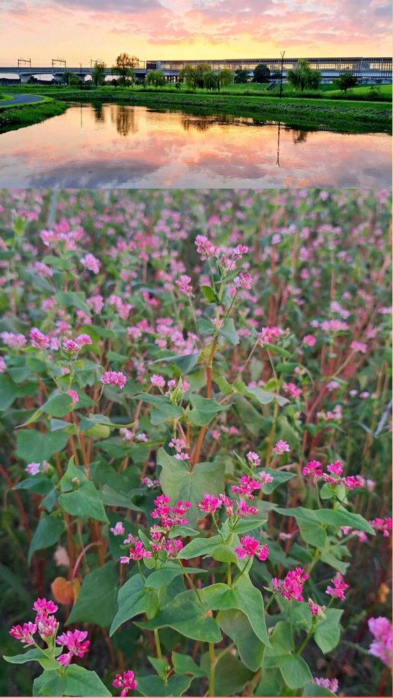 17時50分頃の夕陽と開き始めた高嶺ルビー(赤花蕎麦)