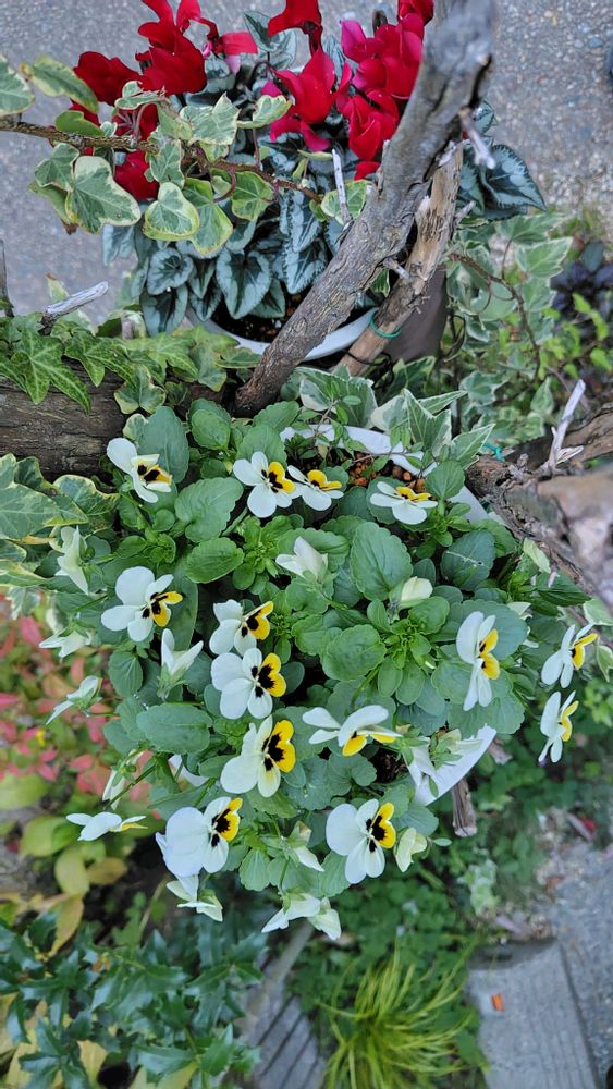 木に這い上がるように仕込んだアイビー。寄せ植えではないけど、アイビーも一緒に、花鉢を彩ってくれて助かってます。