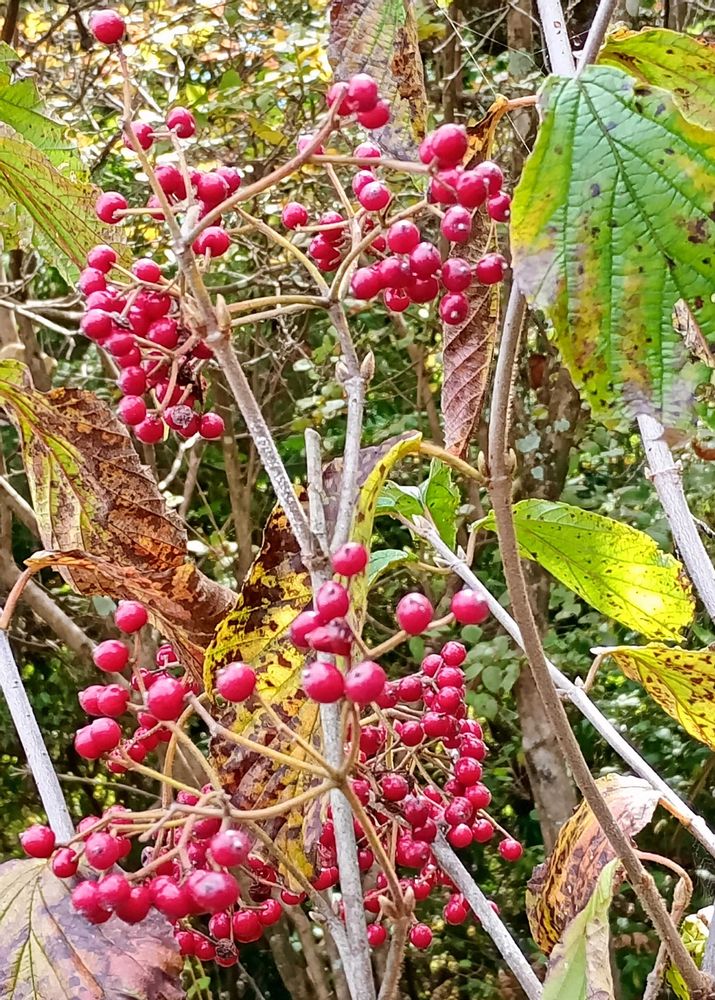 モミジ葉の紅葉はまだまだでしたが、コバノガマズミの赤い実を見つけ〜 秋色に染まりつつある木々の下