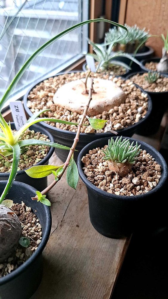 ①葉も枯れて休眠に入ったと思い、部屋に入れたら新しい芽を出すブラキステルマ。結局発根してるのか確認してないけど、たぶんしてるはず😅