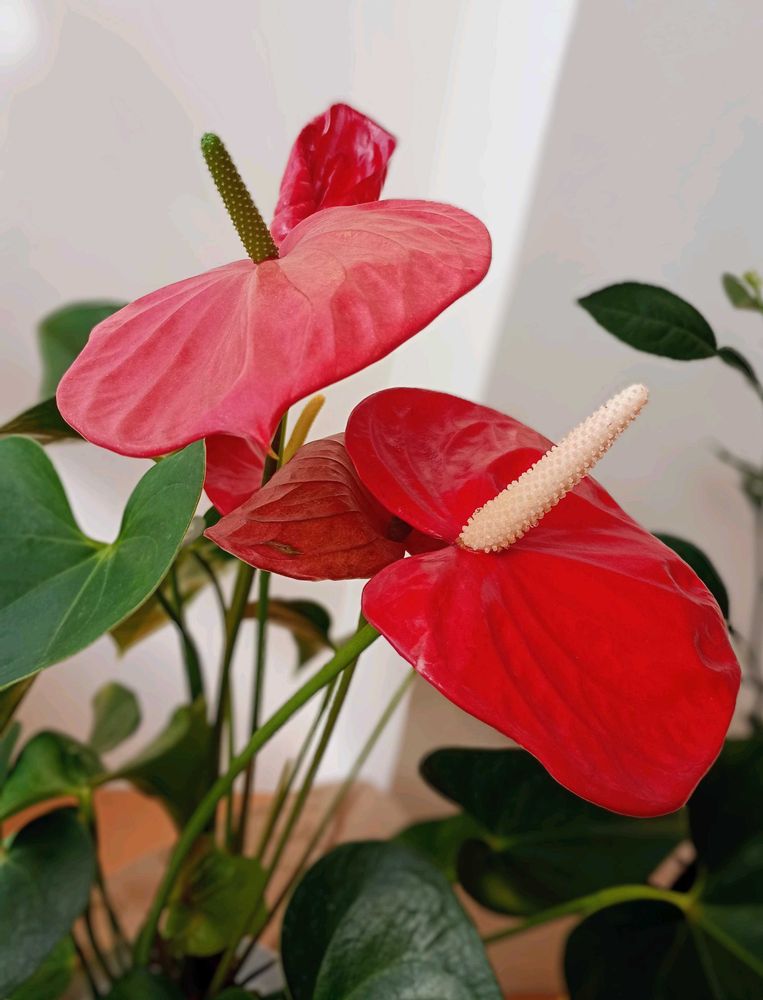 立ち寄り先で見かけたアンスリウム。🔍️【光沢があるハート型❤️の『仏炎苞(ぶつえんほう)』を持つのが特徴の観葉植物です。 じつは仏炎苞は花ではなく、花を包むように葉が進化したもの。 アンスリウムの花は仏炎苞の真ん中から伸びる棒のような部分です】仏炎苞から白と緑がすぅ〜と伸びているのが可愛く🥰📱📸💕