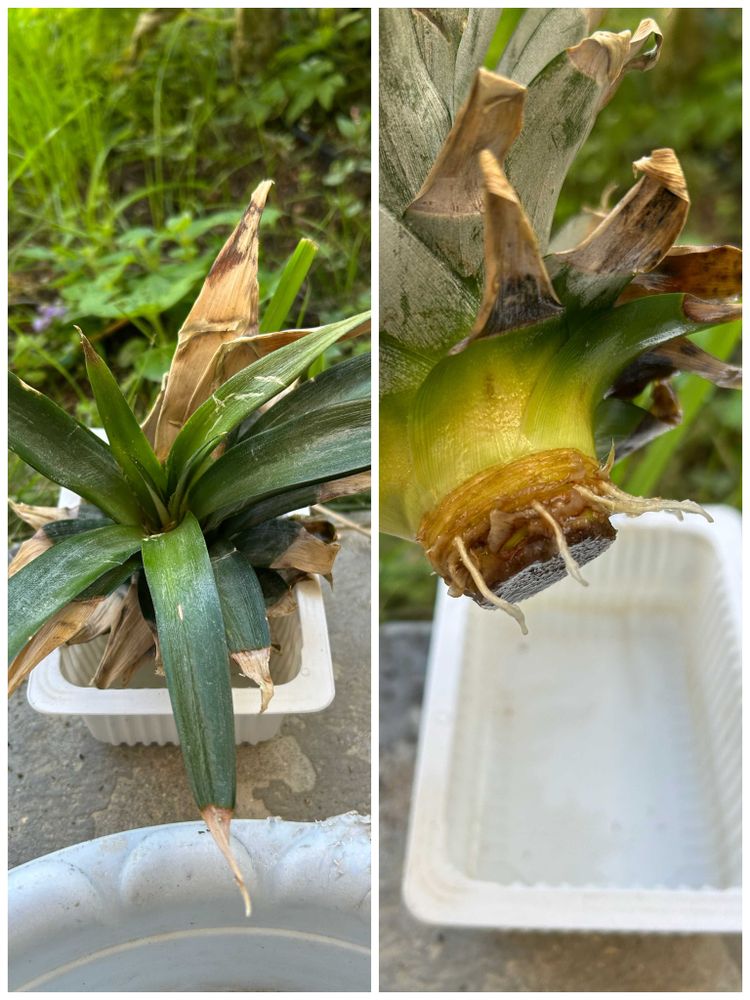 4️⃣9月終わりに食べたパイナップルから根っこ出てきたので鉢に植えました😁