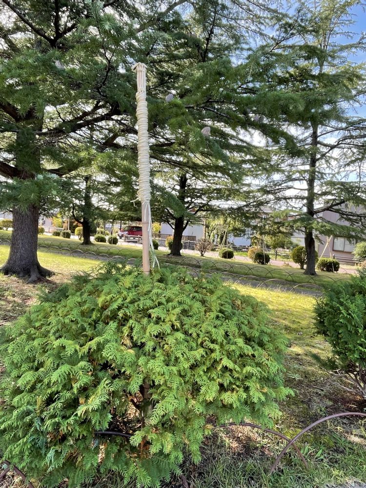 今日の昼 まだ 雪吊り 真ん中の支柱が立っているだけ これから