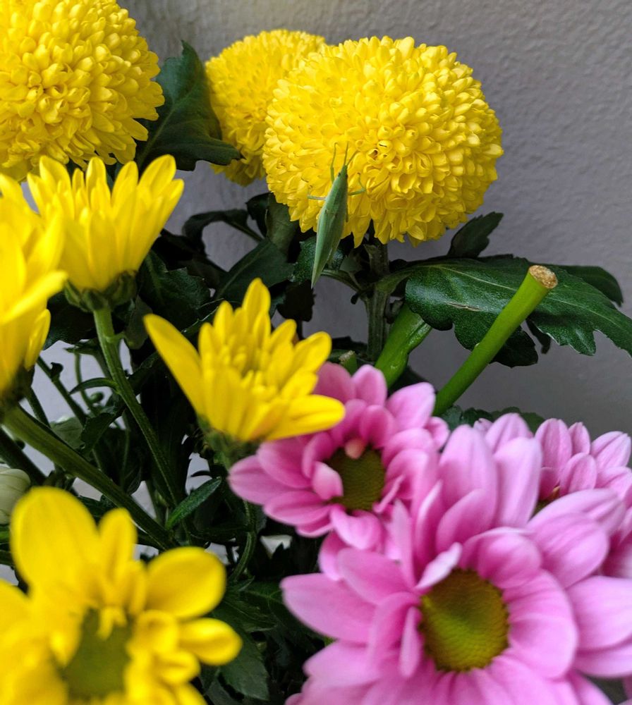 月命日の今朝もしーちゃんバッタサンは居てくれて お花の水を変えるからって 少し移動してまたお花に戻りましたよ🌼🌼