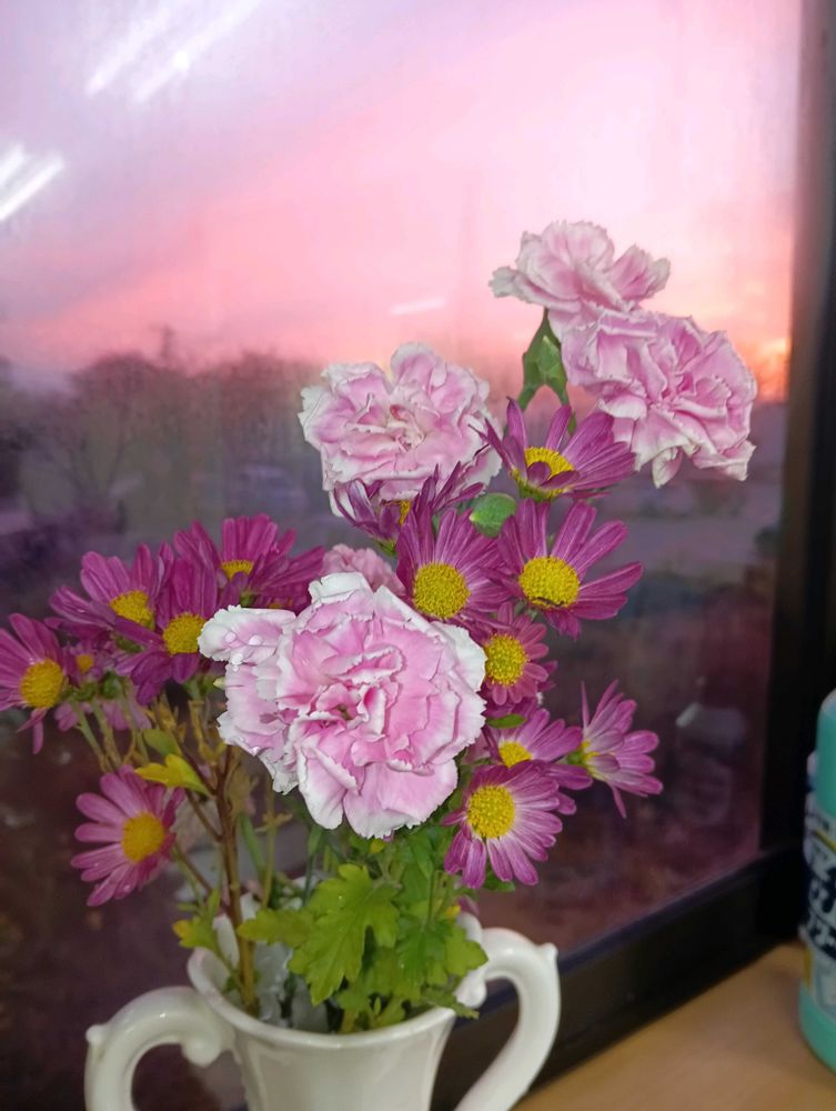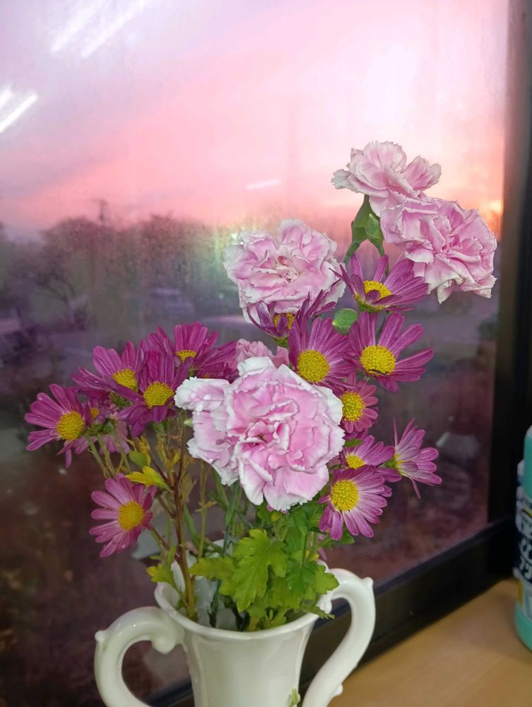 夕焼けがきれい,職場のキッチンフラワーの投稿画像