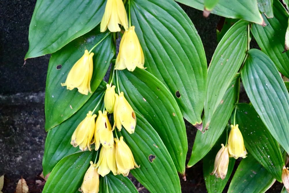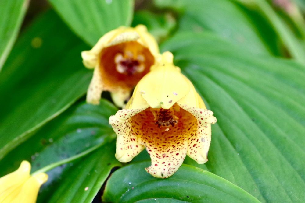 神奈川県産のジョウロウホトトギス。やや小型のタイプで茎は無毛。茎の先に総状花序をつける。葯が黄色。丹沢山塊の一部にのみ生息している絶滅危惧種。岩場から垂れ下がるように鐘状の黄色い花を咲かせます。しゃがんでパチリ💦