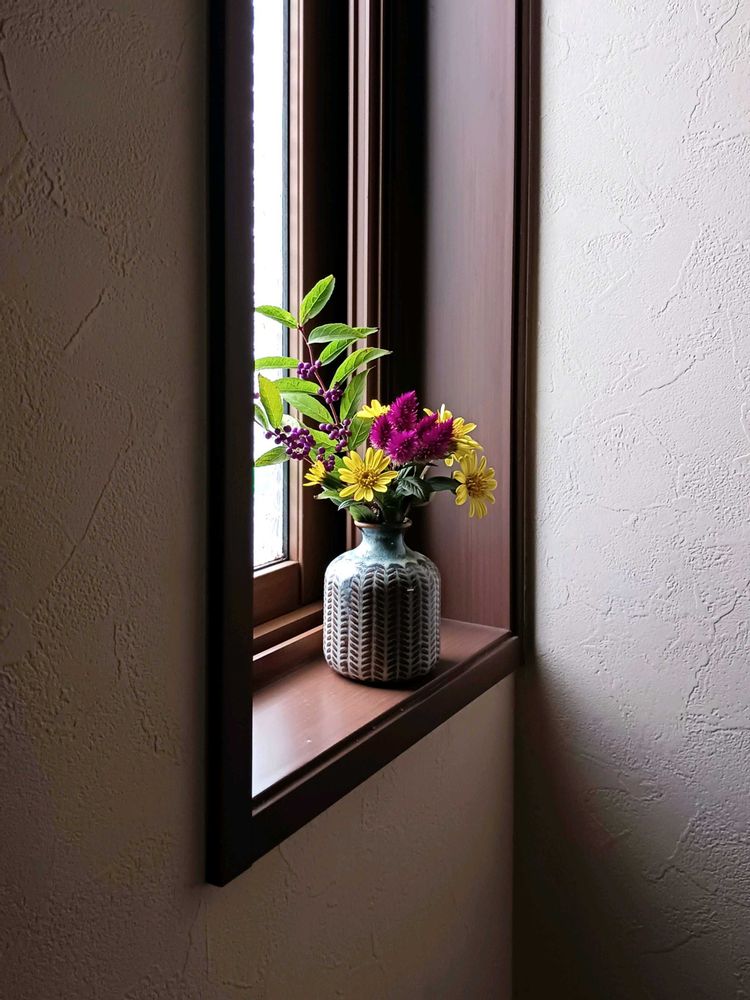 前に生けた中からまだ生きてる花を小さい花器に移して小窓にお引っ越し。
