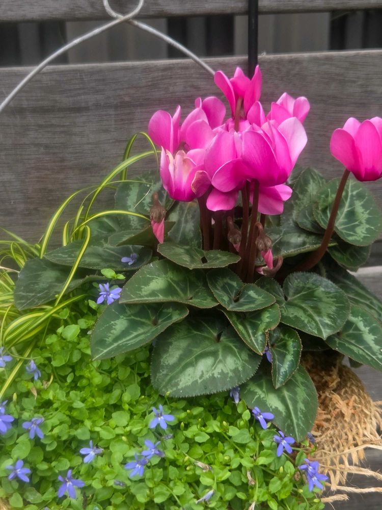 以前、塀に掛けたシクラメンの横に、もう1つガーデンシクラメンの寄せ植えを掛けました。今度は白いプラティアを植え込み。(未だ咲いて無いです)