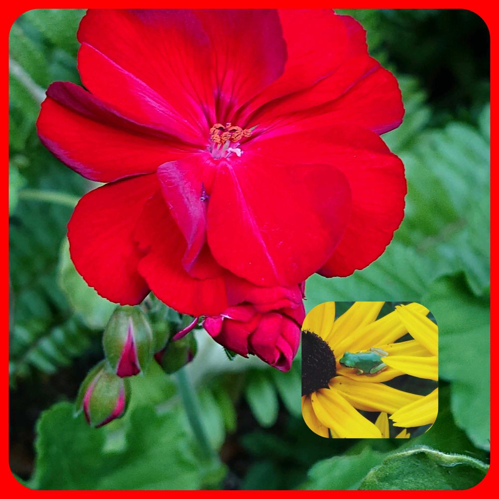 真っ赤なゼラニウム、7月に撮った🐸カエルちゃん、💚🐸ちゃん可愛い~ですねー🤭😃✌️