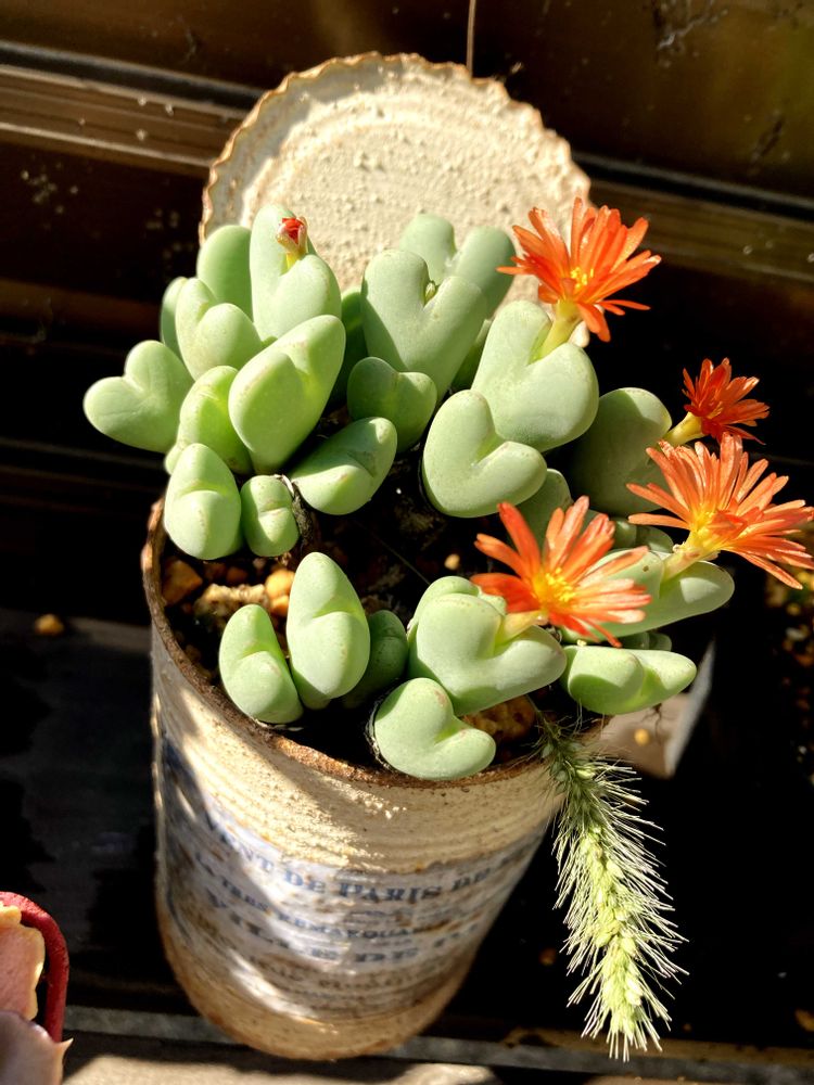 コノちゃん雨ざらしにしたらぷくぷくになって初めてのお花🌸可愛いね〜孫が来てハートの形だね!って自分も植えたくなったんだろうよ!その辺りに生えてる猫じゃらしを挿しよったわ〜ꉂ🤣𐤔𐤔