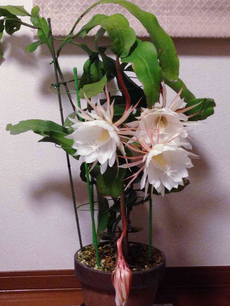 甘い香りとともに大輪の花を咲かせる月下美人です。咲き始めると家中に香りが漂い、夏を感じさせてくれます。これは数年前のものですが見事な満開です。