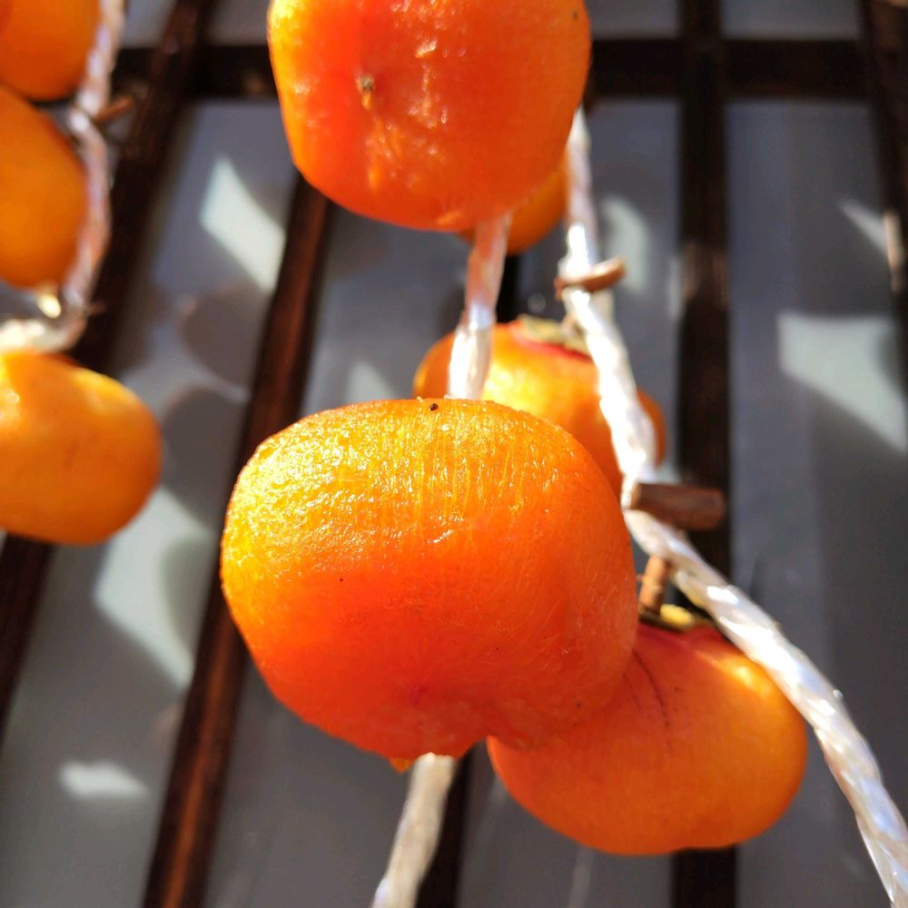 干し柿は今日から2週間くらい天日干ししたら、さらに作業小屋の中で練炭を焚いて乾燥させ、そして束ねて白粉が出たら、やっと出来上がり💓