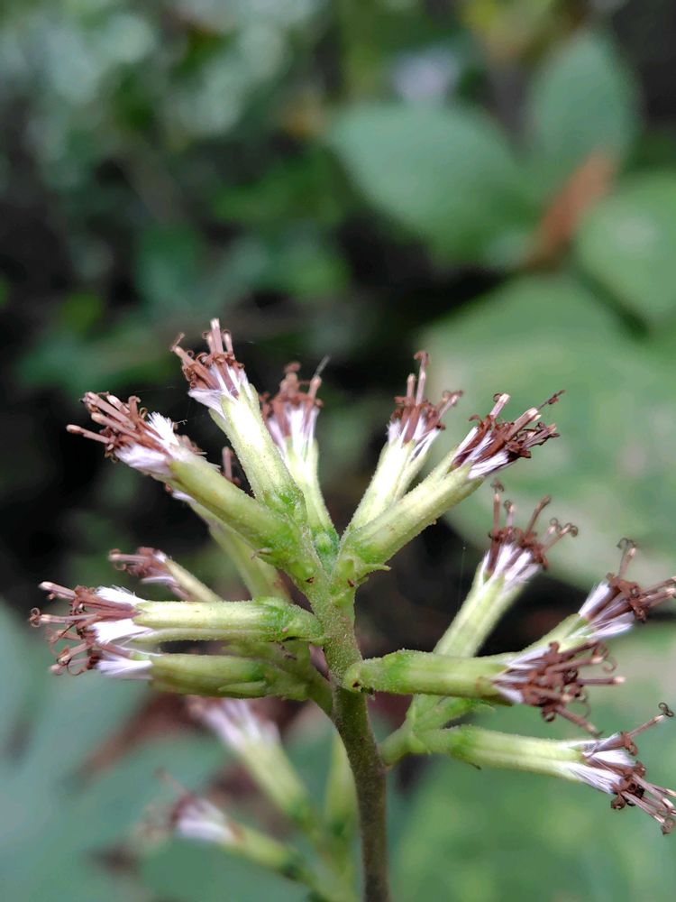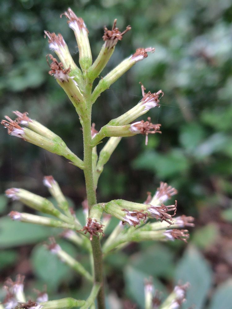 花は円錐花序を作り、やや紫色を帯びた白色の頭花が数十個集まって付く。