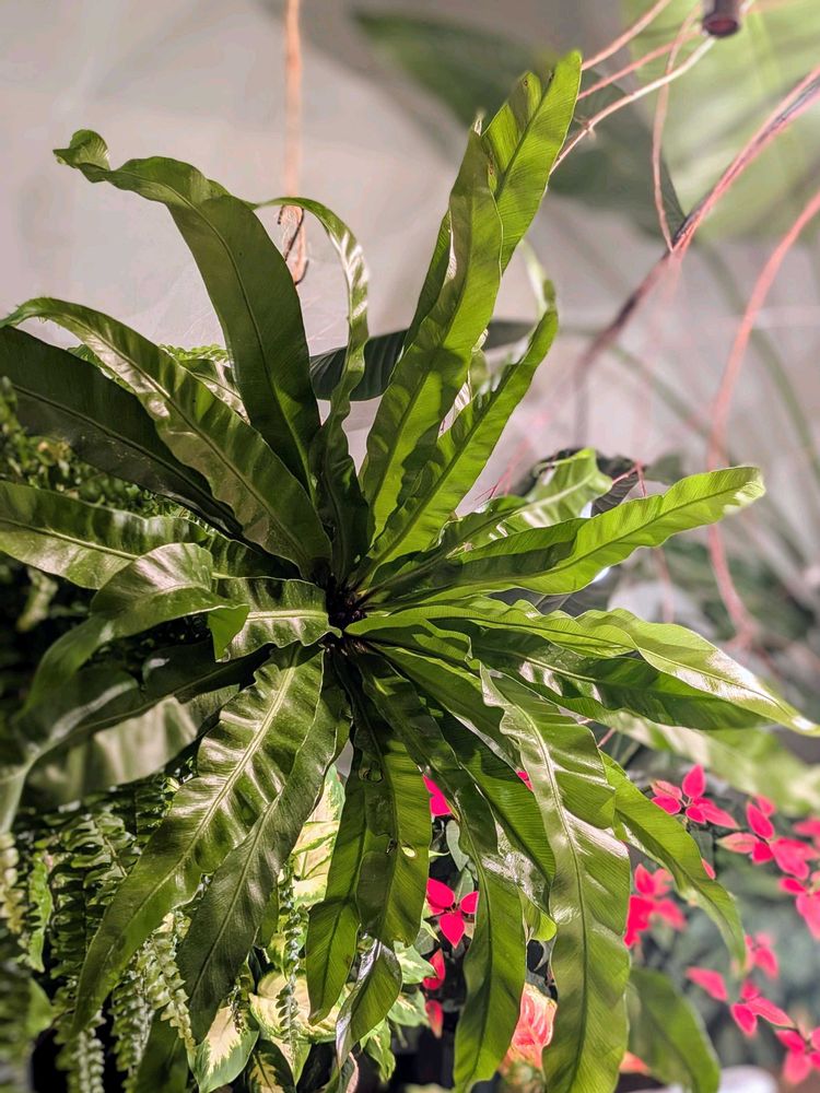 アスプレニウムのグリーンと背後のポインセチアの赤がなんと美しいことでしょう✨