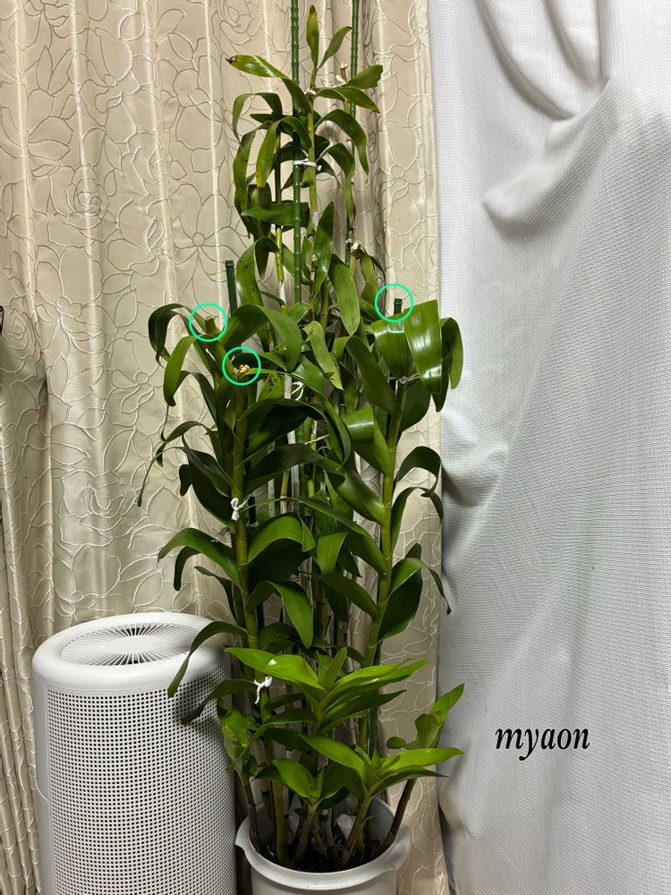 無知は恐ろしいと思う。デンドロビウムにこんなデカくなる種類があったなんて知らなかった…購入した時は10cmと30cmぐらいのバルブが3本だったのよ。それがこんなにデカくなっちゃって、昨年町田で開催されたプランツマーケットで背丈を揃える裏技を教えてもらい今年さっそく試したのが緑の丸〇が付いているバルブ達。成長途中で成長点を引っこ抜いたから花芽はどうなるかな〜でも花芽は前に伸びたバルブにも付くので影響は無いかな😅どうだろうか来年のお楽しみ。