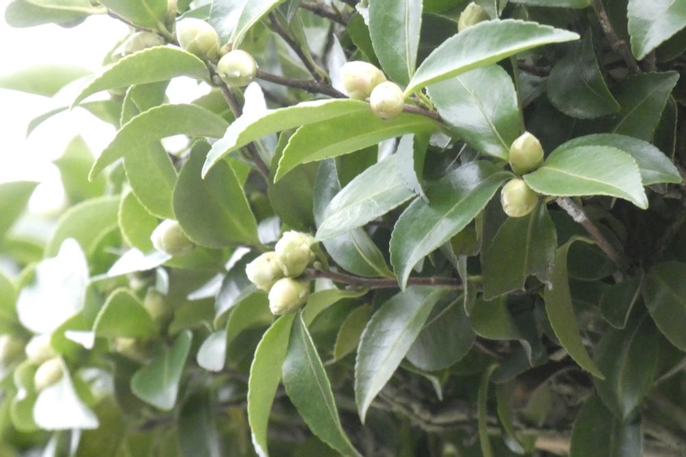 見上げると沢山の蕾たちが付いています。白い八重咲きですが、毎年11月中旬以後に花を咲かせ花びらが♡型なので集めて並べたりしています🤭