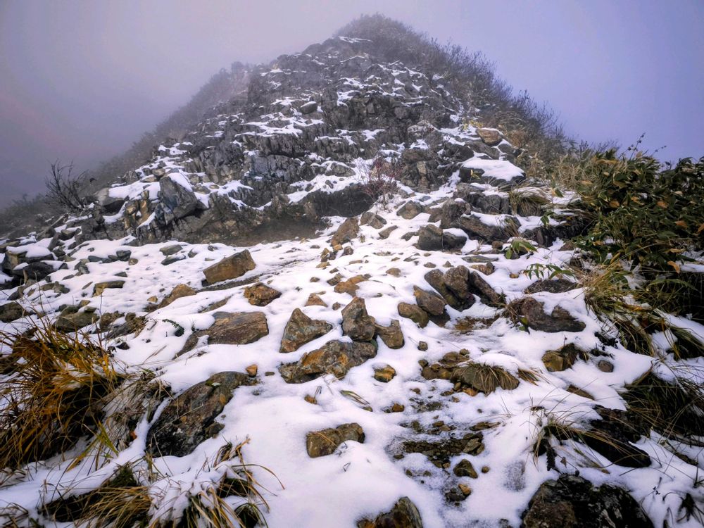 登山開始から2時間もすると完全に雲の中で足元の雪も増えてきて冷たい風も吹き泣きたくなる山行です😂