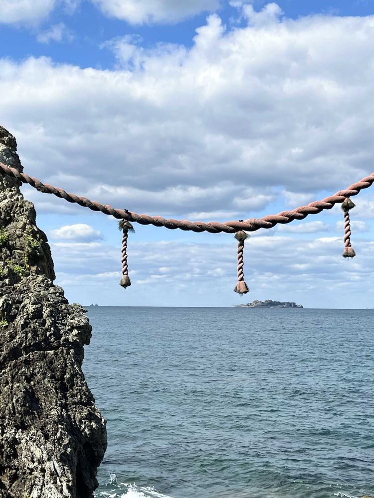 長崎市の天然記念物夫婦岩(軍艦島が遠くに見えます)