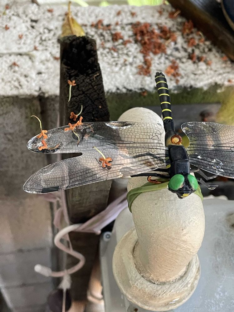 ②今はほぼ散ってます。でもかなり長くもちました。🦟よけのオニヤンマくんの上にも、はらり🏵️