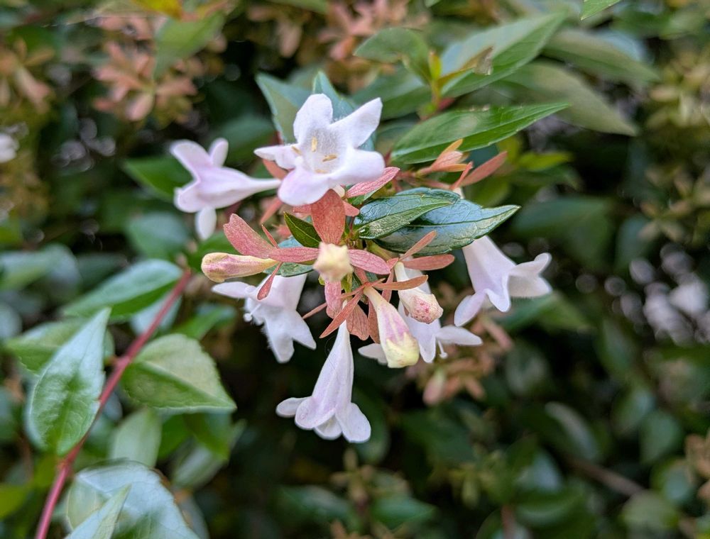 アベリアのお花には最後の蜜を吸いに🐝がきています