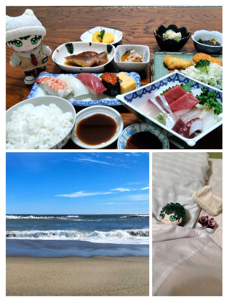 5枚目はその夜、阿字ヶ浦の民宿で頂いた夕食と次の日に海に行った時の写真🍣🌊😀💕