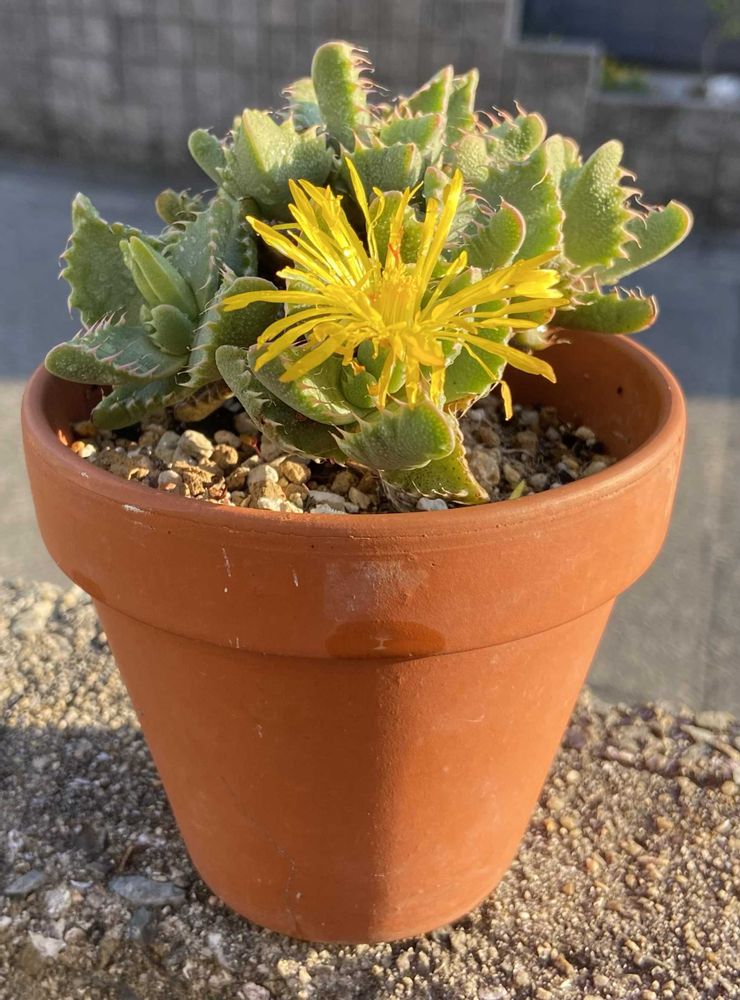 四海波(シカイナミ)は、南アフリカ固有の多肉植物です。現地では、耕作、過剰放牧、都市化のために減少し続けています。多肉質の三角形の葉の縁には白い歯を持っており、小さなワニの顎のように見えます。秋には黄色いデイジーのような花を咲かせ、花は正午頃に開き、夕方前に閉じる性質を持っています。と言うことです。