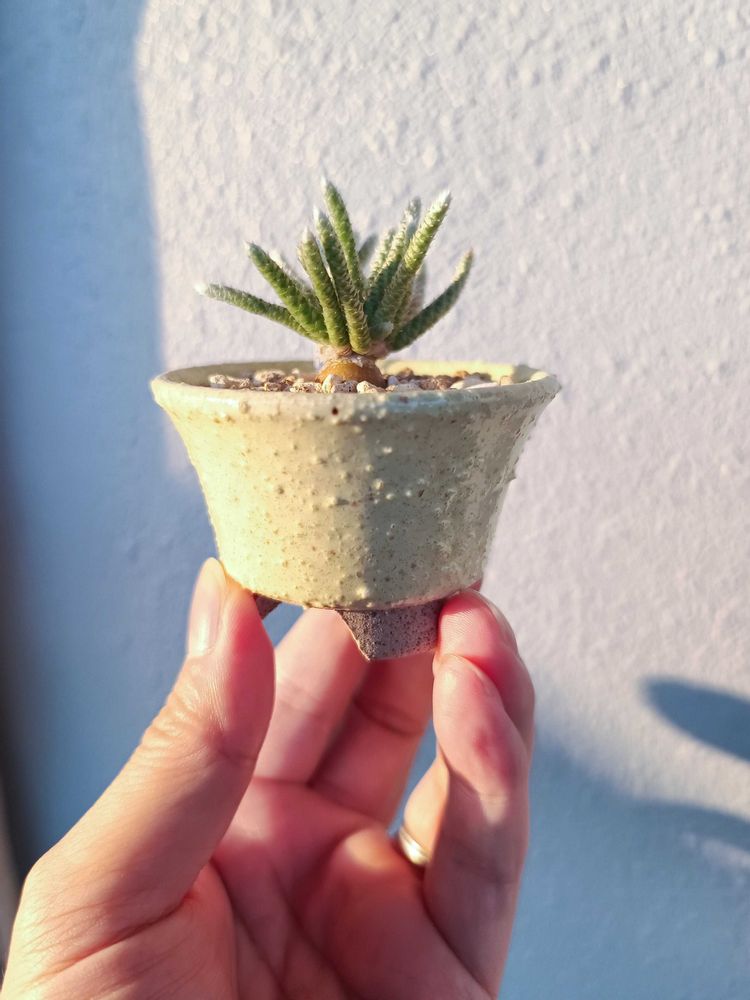 小型で夏型アボニアのベスペルティナはソマリアの超乾燥地帯に自生しているそうなので、できるだけ速乾性を高めたいと思い、小型で浅めの脚付き盆栽鉢を選びました。(たまたま以前に在庫処分品となっていたものを購入して持っていたものなんですけどね…)