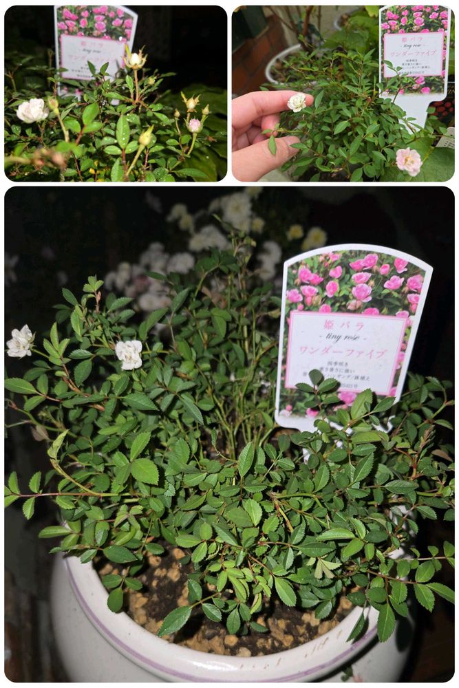 冬期はピンク色、夏期は白と花色が変化するのが特徴の姫薔薇のワンダーファイブ、少し寒い日が続きピンクと白の花が同時に咲きましたd=(^o^)=b