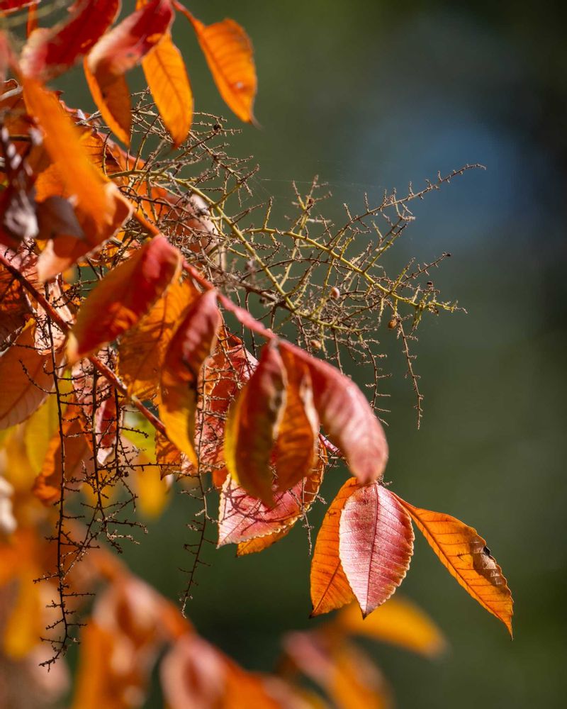 ヌルデの紅葉がピークを迎えていました。実はほとんどボーズ状態で、猛暑の影響?小鳥のお食事痕? 2025.11.04.