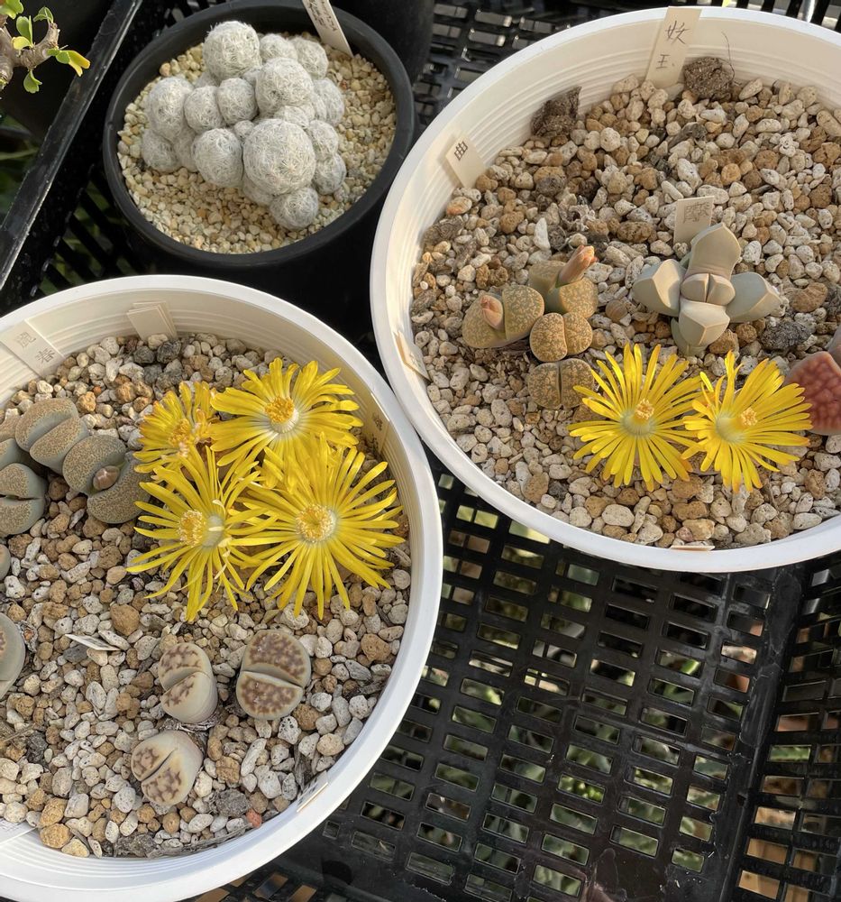 リトープスさん達、今年は開花早い😊夏が暑かったからかな。2枚目はヤフオクの購入株達😅ちょっと怪しい中華系と推測の出品者から買ったらコレ😭合計1渋沢さん😭今まで見たことない出物だったから覚悟の上ですが、酷さ加減は想定の5段くらい上ですな😭もう怪しい出品には手を出さん‼️