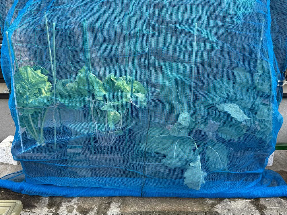 なので 下葉をカットして 倒れてる葉っぱをヒモで支えてネットを掛けました (左から3つ目のおばんざいケールは後日収穫予定です)