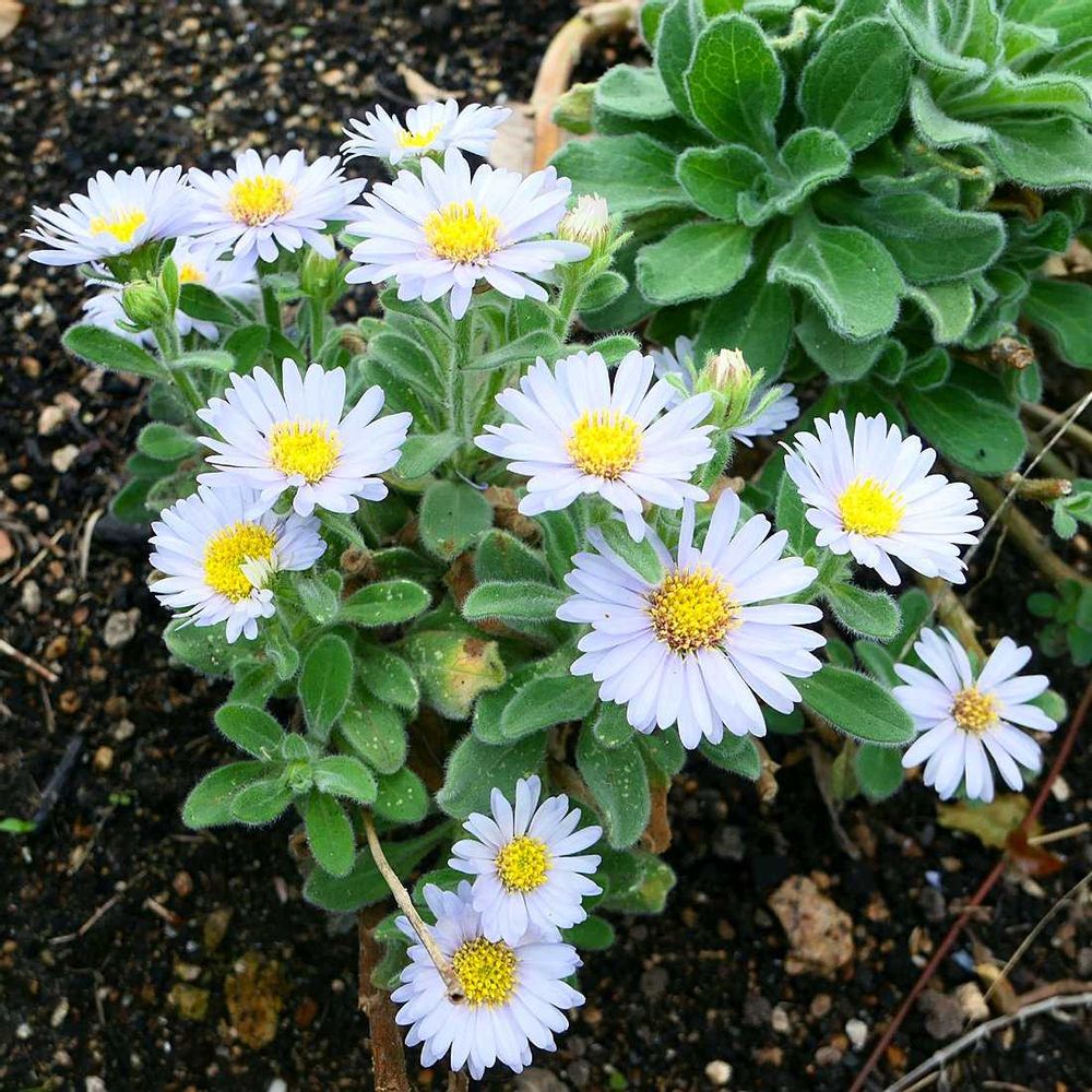 花のつく茎はよく枝分かれして高さ約25㎝になり、径3~4cmの頭花を枝先につける。頭花は淡い青紫色の舌状花と黄色の管状花からなる。