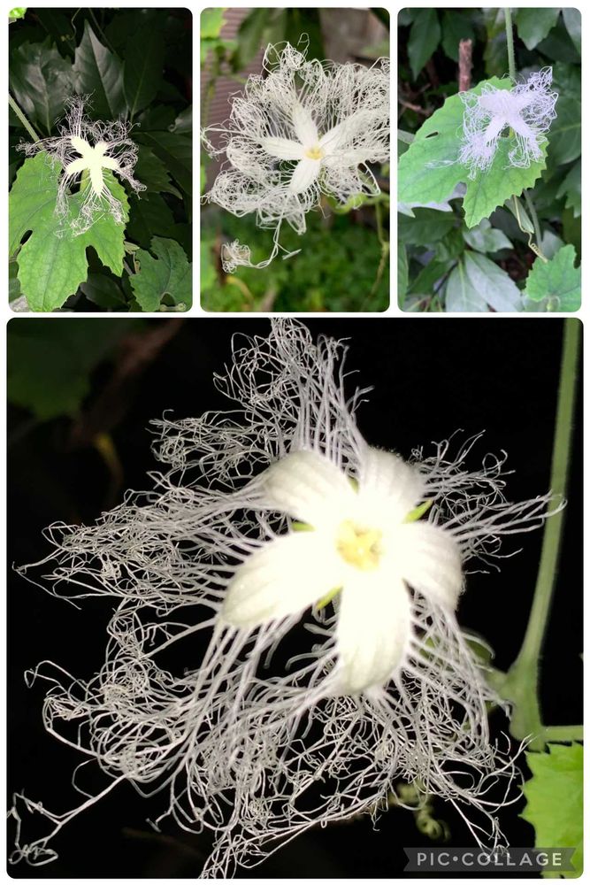 @野葡萄さん ご覧いただきありがとうございます😊カラスウリの花は日没後に咲きます。暗いのでフラッシュ使用で撮った為、ちょっとピンぼけしてしまいました😆不思議な花ですよね❗️