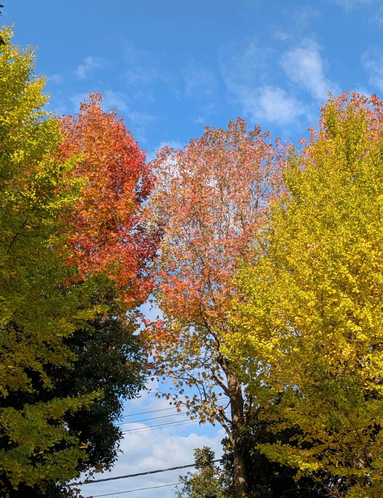 大きなイチョウの木とモミジバフウの葉っぱが紅葉、黃葉して綺麗だねぇ〜🍁💛