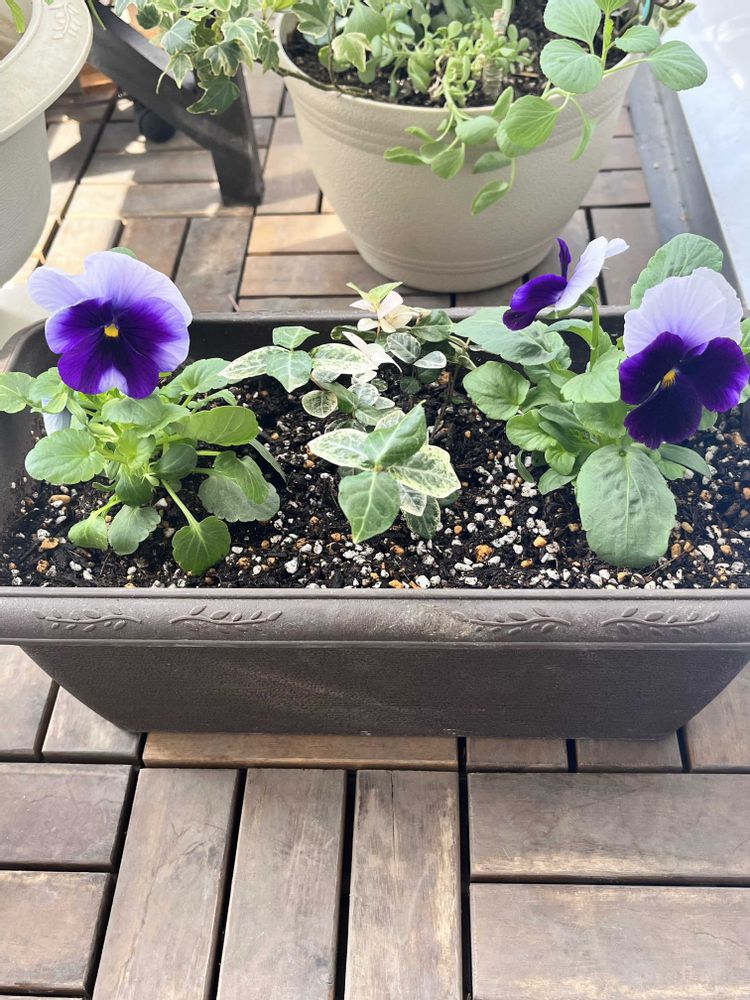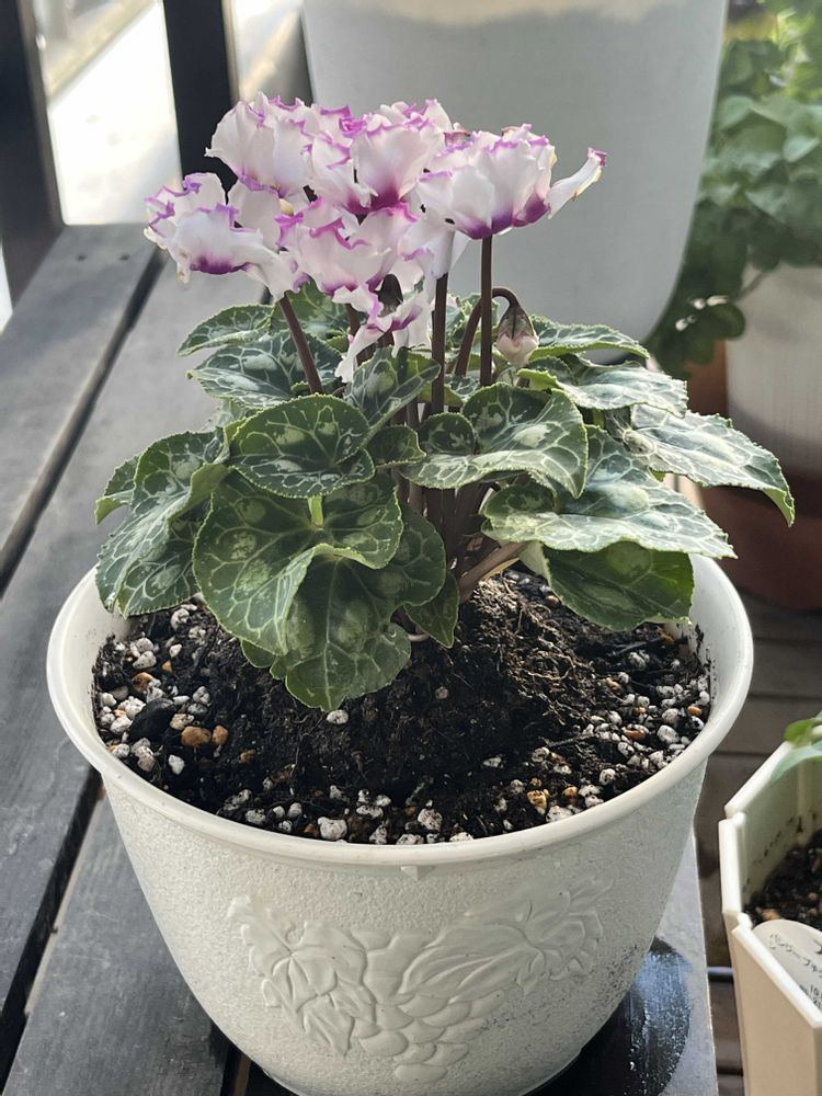 こんにちは✨ いい天気になりました☺️ 1️⃣このまえ園芸店で買ってきた🤍名もなきガーデンシクラメン🎵可愛い💗 2️⃣パンジービーコン2株とハツユキカズラをプランターに植えました😆